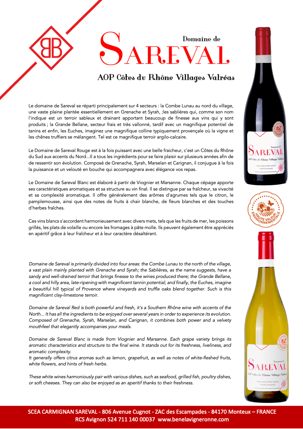 Les vins rouges du domaine de Sareval millésime 2020 présentent une structure solide avec des tanins soyeux de belles notes de fruits et d'épices.